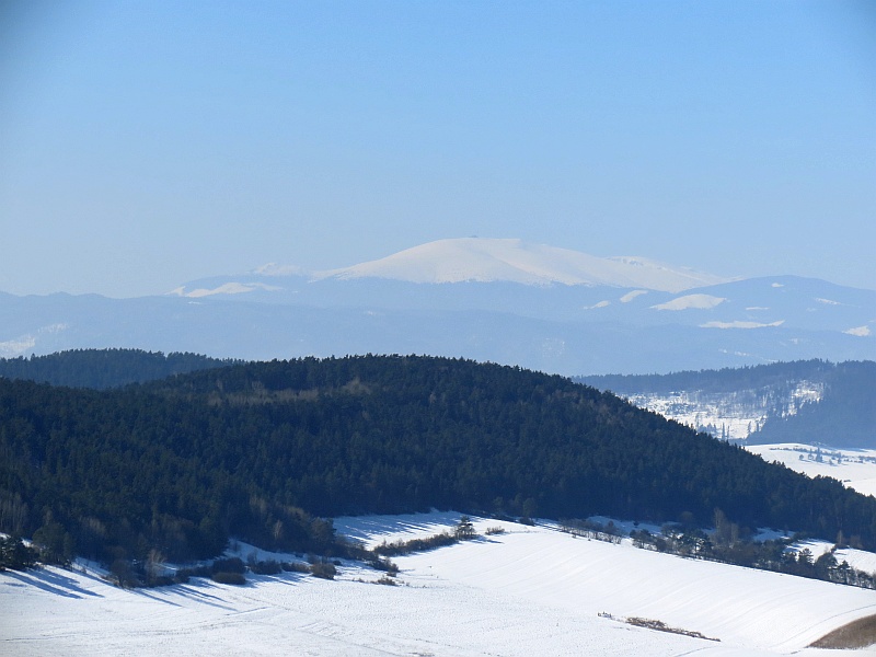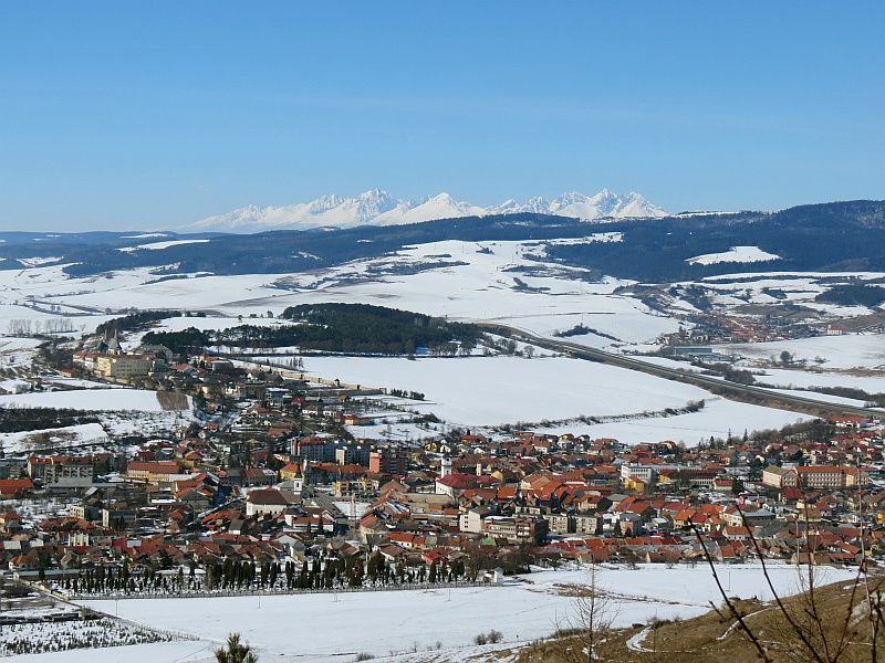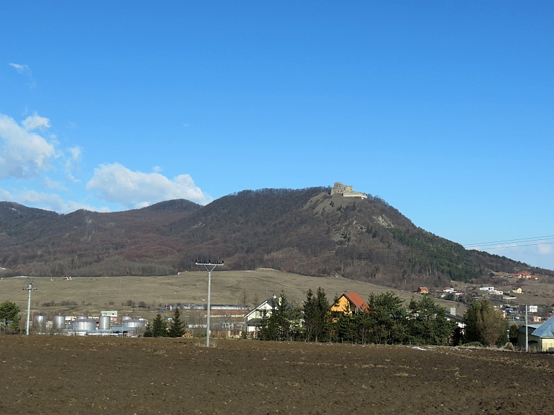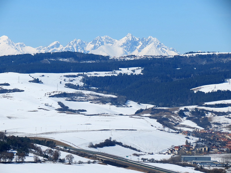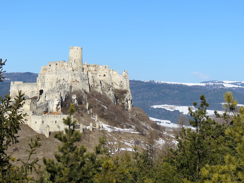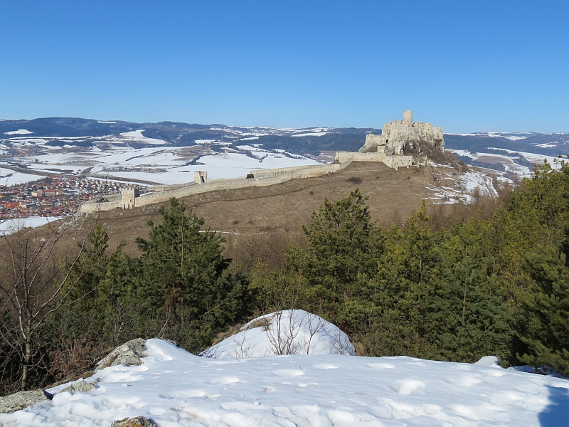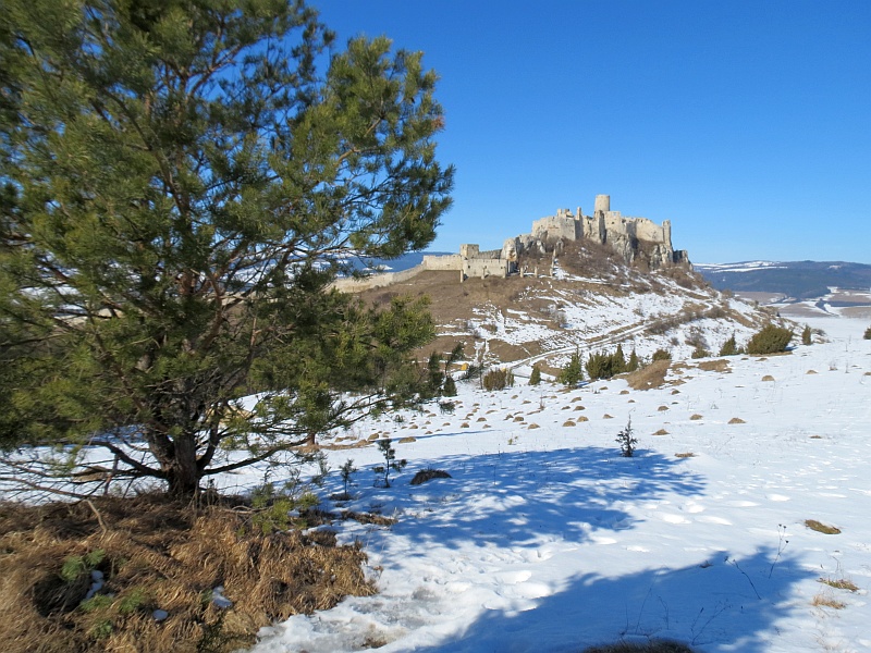Podchodzimy pod zamek i dalej do wejścia, niestety, jak to często bywa na Słowacji, zamek nieczynny, patrzymy tylko przez bramę na dziedziniec i schodzimy w dół. Podchodzę na punkt widokowy – wzniesienie, z którego ładnie widać okolicę, w dole Spisskie Podhradie, zamek w całej okazałości, a tło dla niego stanowią łagodne wzniesienie Gór Lewockich i Braniska, a za nimi strzępią się Tatry Wysokie, bardziej na zachód ośnieżona Kralova Hola, chociaż dziś słabo widoczna.