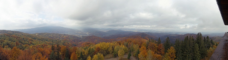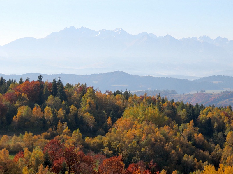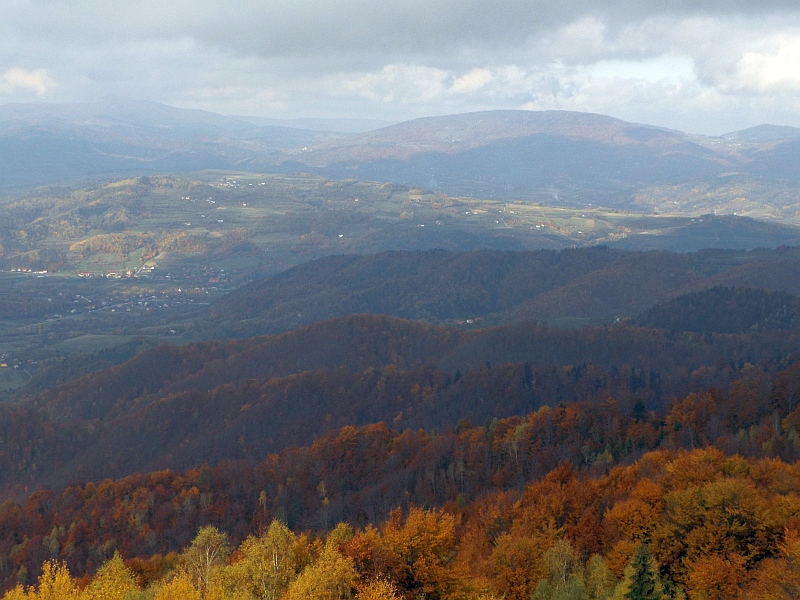 Wycieczka – na Koziarz to był strzał w 10. Jeszcze niedawno nawet nie słyszałem o tej górze. Kolega z pracy opowiedział mi, ze jego znajomy był gdzieś niedaleko, za Nowym Sączem na nowej wieży, z której były oszałamiające widoki. Zaraz potem, wracając ze szkolnym wyjazdem w Pieniny, wracając zauważyłem w Zabrzeży ogromną budowlę dominująca na jednym z wierzchołków ponad Dunajcem. Internet, poszukiwania i jest – to Koziarz, dodatkowo są jeszcze 3 inne bliźniacze wieże: na Lubaniu, Magurce i Gorcu (jeszcze do zrobienia). Udało sie wygospodarować wolne popołudnie i jako-taką pogodę. Na dobrą sprawę można podjechać samochodem praktycznie pod samą budowlę, z króciutkim podejściem, ale nie do końca wiem, gdzie w Brzynie trzeba skręcić, do przysiółka Wielga – leżącego już w obrębie wsi Obidza.  Sam wyjechałem, tak wysoko, jak tylko się da pod wierzchołki Okrąglic. Może to i lepiej, bo szlak jesienią piękny, kolory w maksymalnej pełni, tylko niski pułap chmur mógł trochę denerwować. Już z Okrąglić ładne widoki na Dolinę z Brzyną, szlak dobrze oznakowany, ale w jednym miejscu trzeba uważać, żeby nie zboczyć z niego. Dziwi mnie, w jakich niedostępnych miejscach żyją ludzie. Wierzchołka przez większość drogi nie widać, tak, że ciężko ocenić, ile jeszcze zostało. Przed samym Koziarzem jest dość konkretne zejście, tak, że trzeba z powrotem podejść kawałek. Gdy pojawia się wieża, budzi respekt. Naprawdę potężna i solidna konstrukcja. Można w razie załamania pogody spokojnie się tu schować, szerokie schody z poręczami, osoby z lekiem wysokości nie mają się czego bać. Są też kamerki internetowe, do obejrzenia na stronie gminy Ochotnica. Widok rzeczywiście imponujący jesienne Gorce i Beskidy w ciekawym oświetleniu wyglądają bajecznie. Jak nie jestem fanem Beskidów, to ta wycieczka była jedną z ładniejszych tego roku, a wieża – to strzał w 10 jako punkt widokowy, nie widziałem ładniejszej panoramy w Beskidach Zachodnich. Jest też możliwość podejścia z Tylmanowej, ale dla mnie dużo bliżej z Brzyny. Nie widzę dziś Tatr, bo wieje i niski pułap chmur, gdybym miał więcej czasu, pewnie bym zobaczył, bo pogoda wyraźnie się poprawia. Już w drodze powrotnej dobrze widać całego Lubania i Mogielicę. Ale dla mnie najciekawszy obrazek to przełomowy odcinek Dunajca w Zabrzeży. Dolina wygląda bardzo malowniczo. No i te kolory, szkoda że są one tak krótko i trzeba odpowiednio trafić na czas i pogodę. Powtórzeyłem tą wycieczkę jeszcze w marcu i znów w październiku, tym razem z piękną pogodą. Widoki naprawdę pierwsza klasa. Sam projekt budowy wież budzi wiele zastrzeżeń wśród obrońców przyrody, że wycięto wiele drzew i dokonano zniszczeń, ale mi się zdaje, że przyroda je naprawi, a wieże pozostaną, nadając sens beskidzkim wędrówkom. Dla mnie ważne są widoki, które w tych górach często są przesłonięte przez lasy.