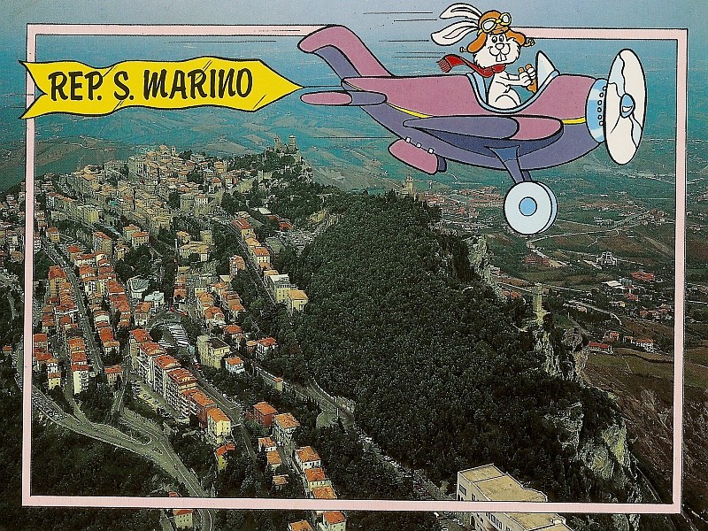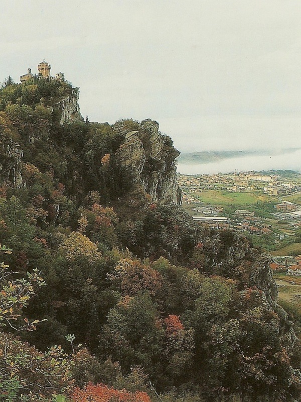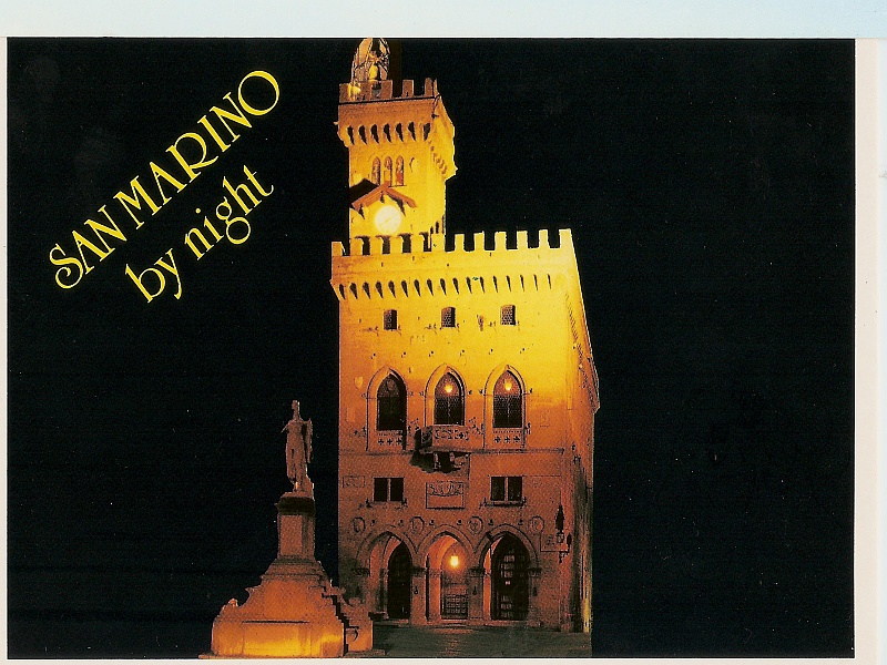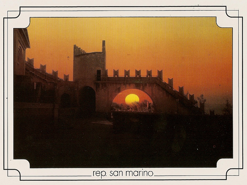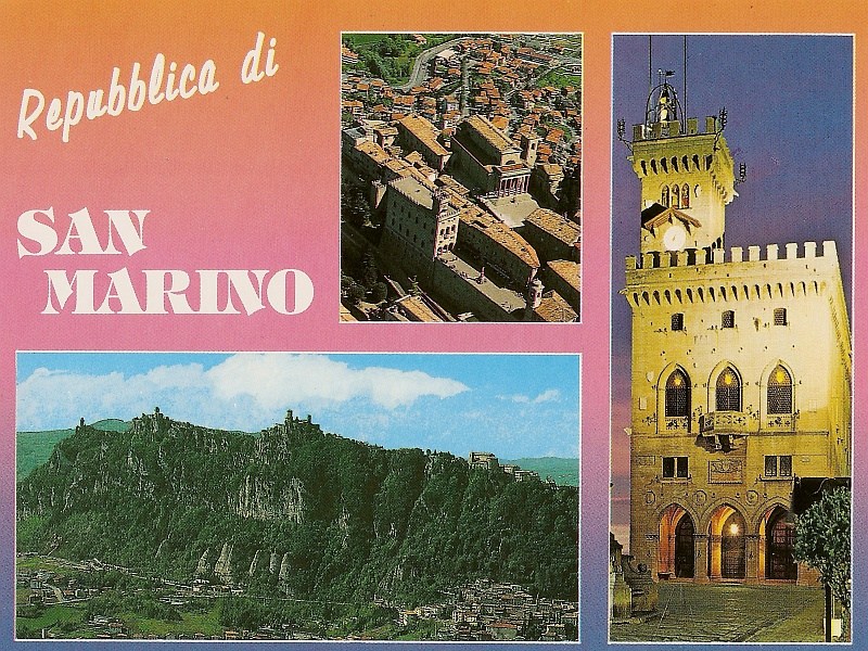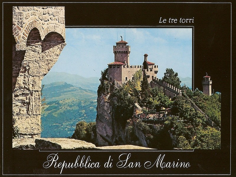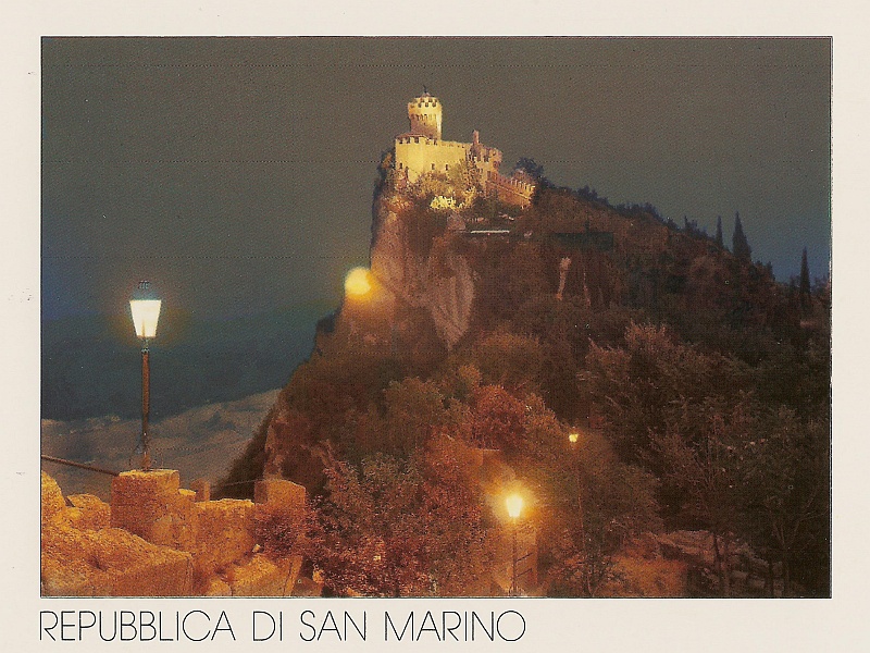 San Marino uważa się za najstarszą republikę świata, utworzoną A.D. 301 przez utalentowanego chrześcijańskiego budowniczego, kamieniarza (inni podają, iż był kowalem) zwanego Świętym Marinusem. Gdy uciekał przed prześladowcą chrześcijan – cesarzem rzymskim Dioklecjanem, ukrył się na szczycie Monte Titano (najwyższe z siedmiu wzgórz San Marino) i tam założył małą wspólnotę chrześcijańską. Atrakcją San Marino są La Rocca o Guaita, La Cesta o Fratta oraz Montale, czyli 3 zamki – fortyfikacje. Warto kupić tutejsze wyroby alkoholowe – sprzedawcy chętnie dają spróbować tego wyrobu – oczywiście reklamują własne wina i wódki, można się nawet za darmo upić próbując wszelkie trunki. Oprócz rejestracji – RSM praktycznie nie czujemy że nie jesteśmy we Włoszech. Byliśmy tam dwa razy – raz w drodze w Apeniny, drugi raz – w powrotnej, za każdym razem późnym wieczorem, więc nie robiłem zdjęć, jedynie zakupiłem pocztówki.